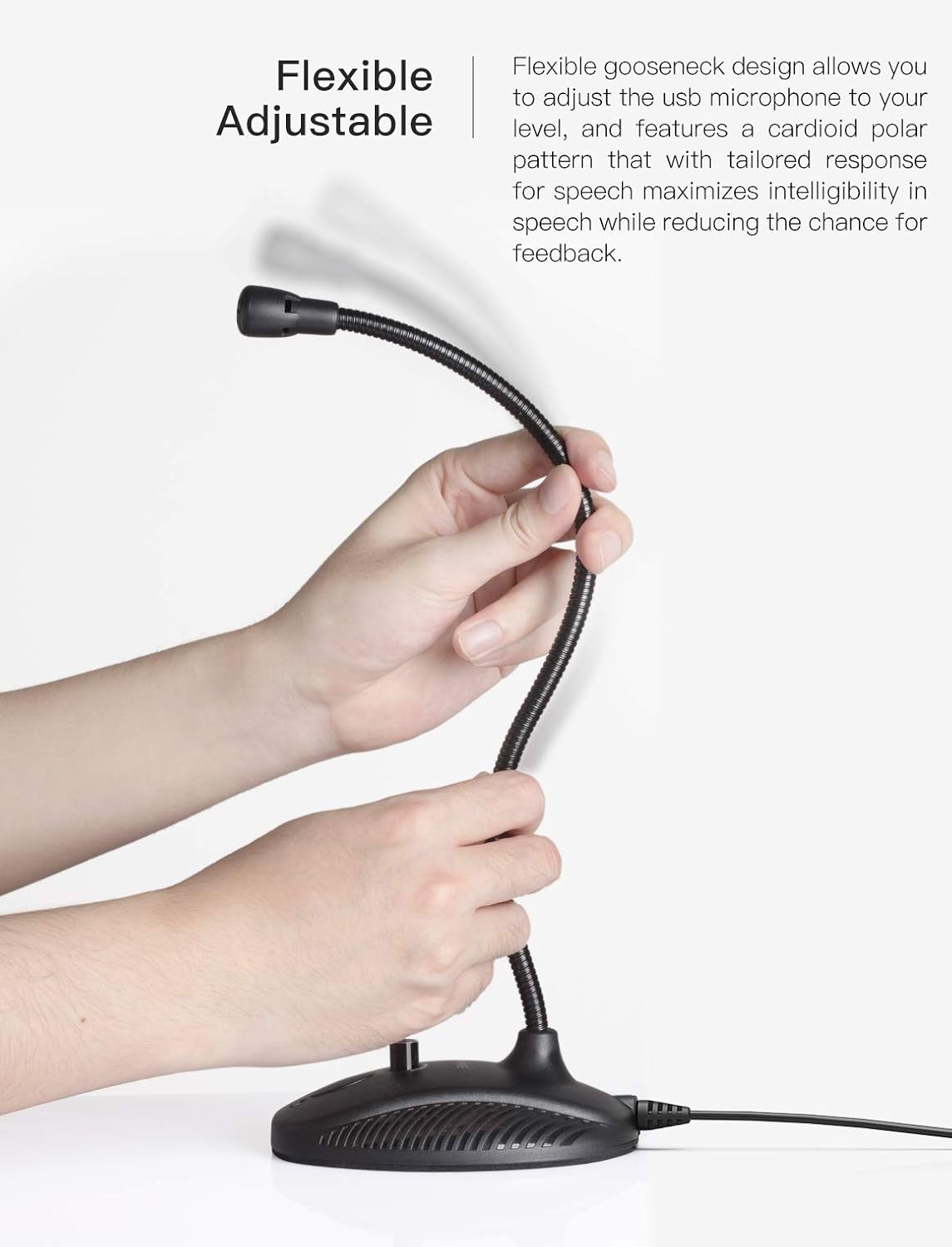 - [Smooth Recording] Flexible gooseneck design allows you to adjust the USB microphone for PC to your level, and features a cardioid polar pattern that with tailored response for speech maximizes intelligibility in speech while reducing the chance for feedback.A suitable solution for meetings and presentation applications,improve people's ability to hear within the Zoom video conference software.