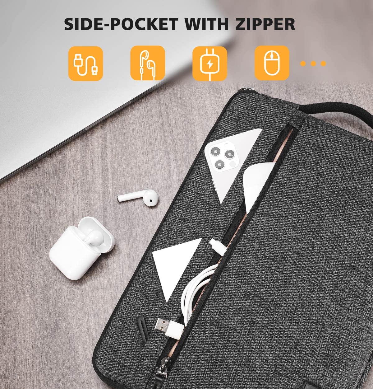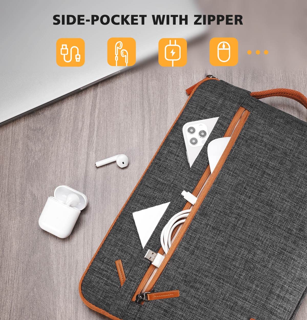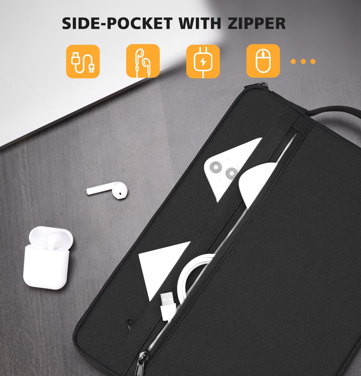 • Front 2 Pockets With Zipper - Enough space to keep charger, cables, USB and other business essentials, cards or pens could placed on the built-in small pockets to avoid rubbing against other things.