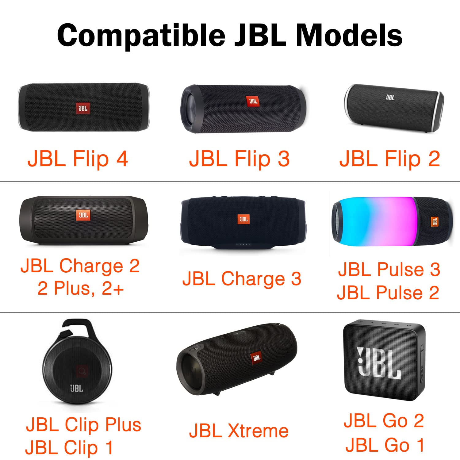 - Fit for JBL Flip 2, Flip 3, Flip 4, JBL Pulse 2, JBL Pulse 3, JBL Clip, JBL Clip Plus, JBL Charge 2+, JBL Charge 3, JBL Xtreme, JBL Go 2