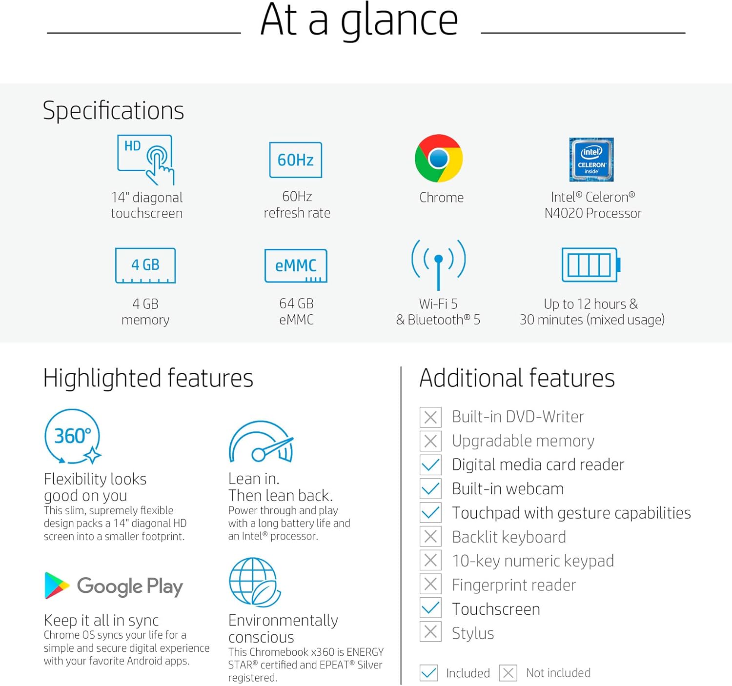 HP Laptop X360 14a- 14" Chromebook, HD Touchscreen, Intel Celeron N4020, 4GB LPDDR4 RAM, 64GB eMMC, WiFi, Webcam, BO Speakers, Bluetooth 4.2, Chrome Blue (Renewed)