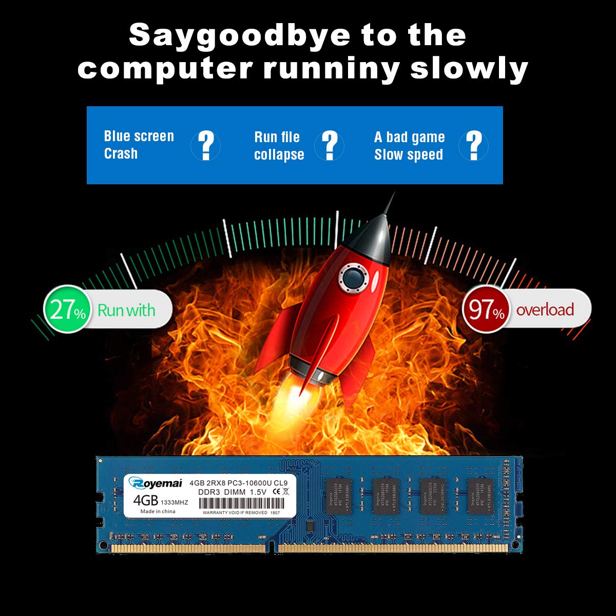 Bitte beachten Sie: Falls der Arbeitsspeicher nicht in Ihren Computer passt, überprüfen Sie bitte vor dem Kauf die Parameter Ihres Computers, wie z. B. das RAM-Modell, den RAM-Steckplatz und die maximale Speicherkapazität. Hohe Stabilität dank hochwertiger Originalteile und strenger Fertigungsprozesse. Alle Chips stammen von namhaften Herstellern und werden strengen Tests und Auswahlverfahren unterzogen. Ein fortschrittliches Galvanisierungsverfahren an den Kontaktstiften verbessert die Korrosionsbeständigkeit und elektrische Leitfähigkeit. Nach einem Langzeit-Einbrenntest und einem Temperaturtoleranztest auf gängigen Systemplattformen wurde die hohe Stabilität und Leistungsfähigkeit des ROYEMAI-Speichers bestätigt. Schneller und flüssiger: ROYEMAI-RAM wurde entwickelt, um Ihr System schneller und flüssiger laufen zu lassen – eine der einfachsten Möglichkeiten, die Systemleistung zu verbessern. Programme laden schneller, die Reaktionsfähigkeit wird erhöht, datenintensive Anwendungen laufen problemlos und die Multitasking-Fähigkeiten Ihres Desktops werden gesteigert. Nach dem Einbau von mehr Arbeitsspeicher reagiert Ihr Computer spürbar schneller, insbesondere bei vielen geöffneten Fenstern. Hohe Kompatibilität : Um die Kompatibilität mit Intel- und AMD-Systemen zu gewährleisten, wurde ROYEMAI-RAM mit allen gängigen Mainboard-Marken getestet. Testergebnisse zeigen, dass der Speicher die für den Langzeitbetrieb in Computern aller Marken erforderliche hohe Leistung und Stabilität bietet. Häufige Fehlerdiagnose: 1. Computer schaltet sich ein, aber es wird kein Bild angezeigt. ☛ Bitte reinigen Sie die Kontaktflächen mit einem Radiergummi. Verwenden Sie keine ätzenden Substanzen wie z. B. Alkohol. 2. Windows startet häufig automatisch im abgesicherten Modus. ☛ Bitte verringern Sie die Datenlesegeschwindigkeit im CMOS-Speicher. 3. Computer stürzt zufällig ab. ☛ Bitte verringern Sie die Datenlesegeschwindigkeit im CMOS-Speicher. Falls dies nicht hilft, verwenden Sie RAM mit der gleichen Frequenz.