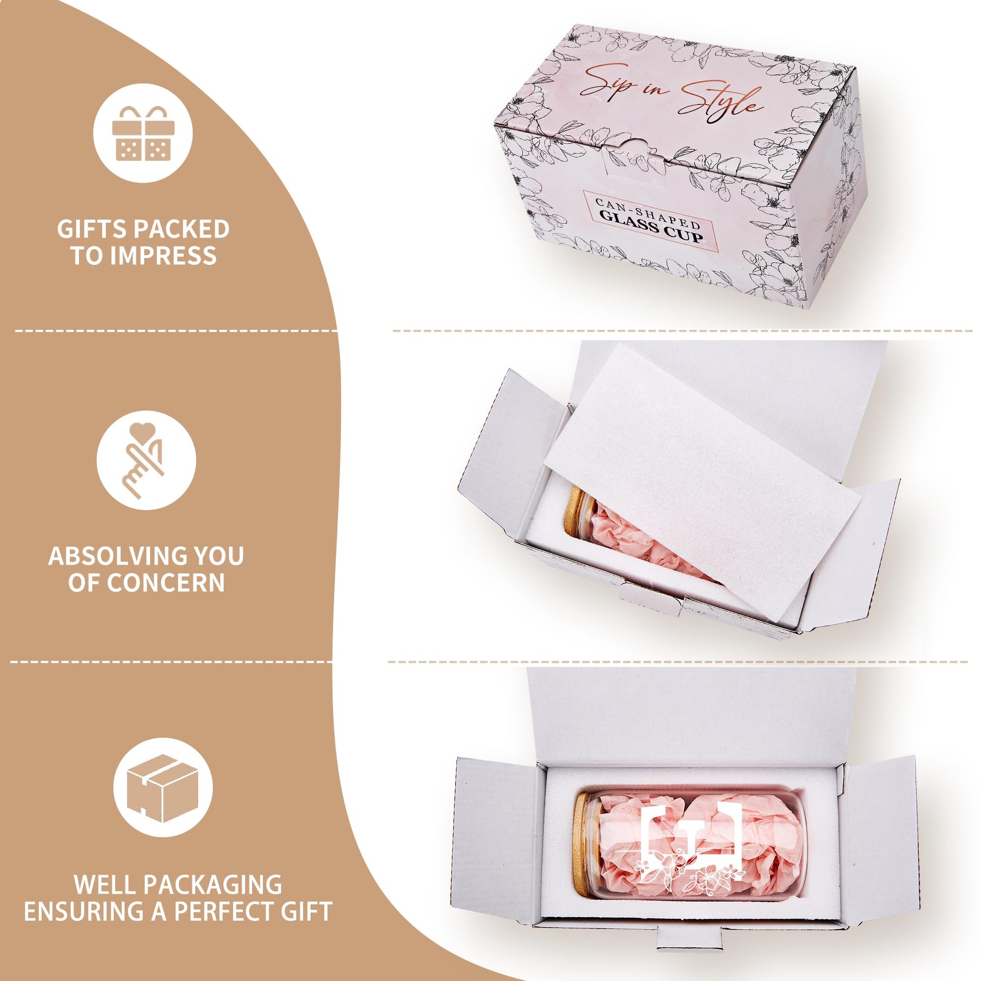 Jedes Gläserset enthält: 1 Glasbecher; 1 Bambusdeckel; 1 Strohhalmbürste; 1 Strohhalm aus Borosilikatglas, 1 Strohhalm aus Tritan, 1 Strohhalm aus Edelstahl;