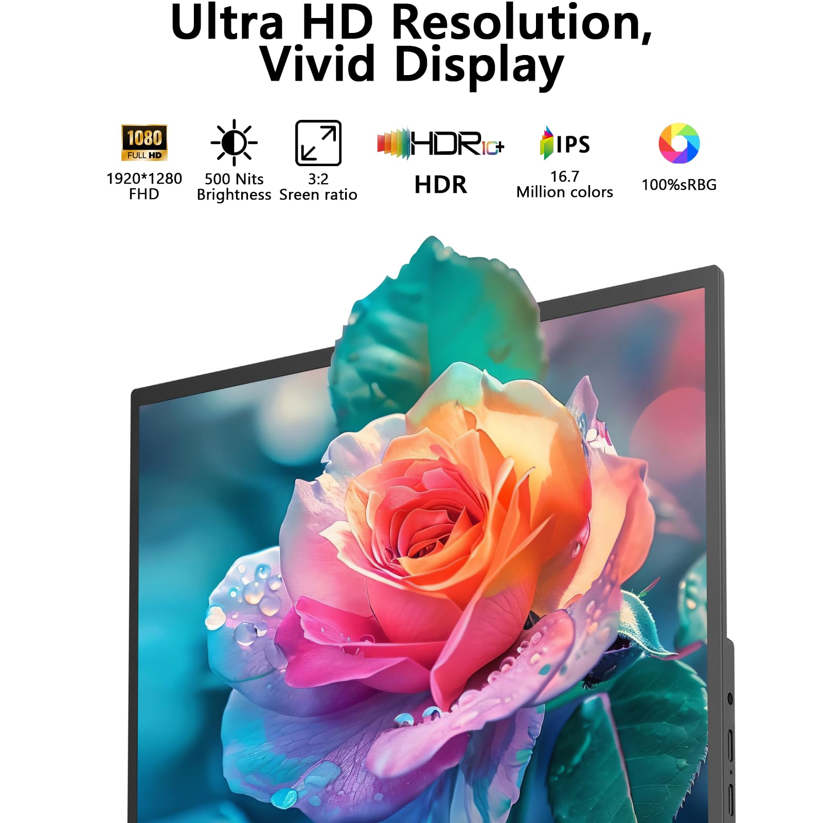 Tragbarer Monitor für Laptops, 10,5"-Bildschirmerweiterung (1920 x 1280 Pixel), IPS-Display, 3:2-Format, 500 cd/m², Kontrastverhältnis 2000:1, mit um 45° verstellbarem Standfuß, Standard-HDMI- und USB-C-Anschluss für Laptops, PCs, Smartphones, Macs, PS4 und Xbox.