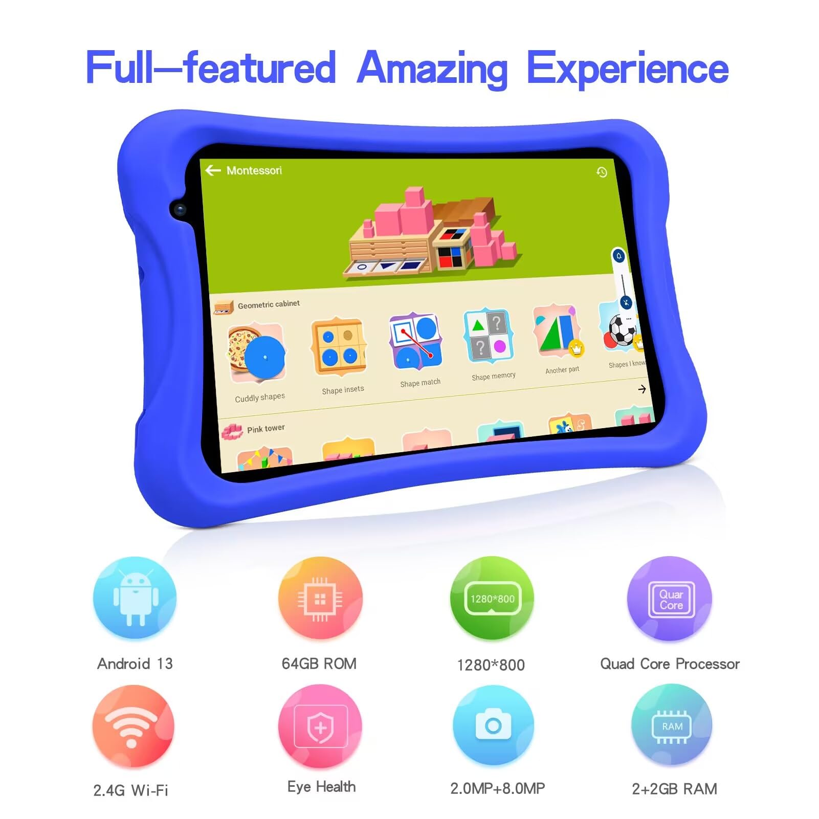 PRITOM 8-Zoll-Quad-Core-Android-Tablet, 64 GB, WLAN, Bluetooth, Dual-Kamera, Lern-Apps, Spiele, Kindersicherung, Kindersoftware mit Tablet-Schutzhülle (Blau)