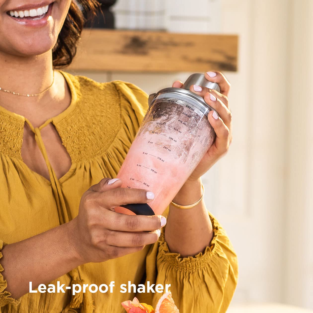 Margaritas, Daiquiris, Mai Tais und mehr! Perfekt gemixte Cocktails zu Hause zuzubereiten war noch nie so einfach. Mit gut lesbaren Messskalen auf dem Glas und einem Deckel, der gleichzeitig als 45-ml-Messbecher dient, ist dieser 530-ml-Cocktailshaker aus Glas genau das Richtige für Ihre nächste Party. Dank des auslaufsicheren Designs können Sie Cocktails bedenkenlos shaken, und der Silikonfuß verhindert Verrutschen und Verschütten auf der Arbeitsfläche.