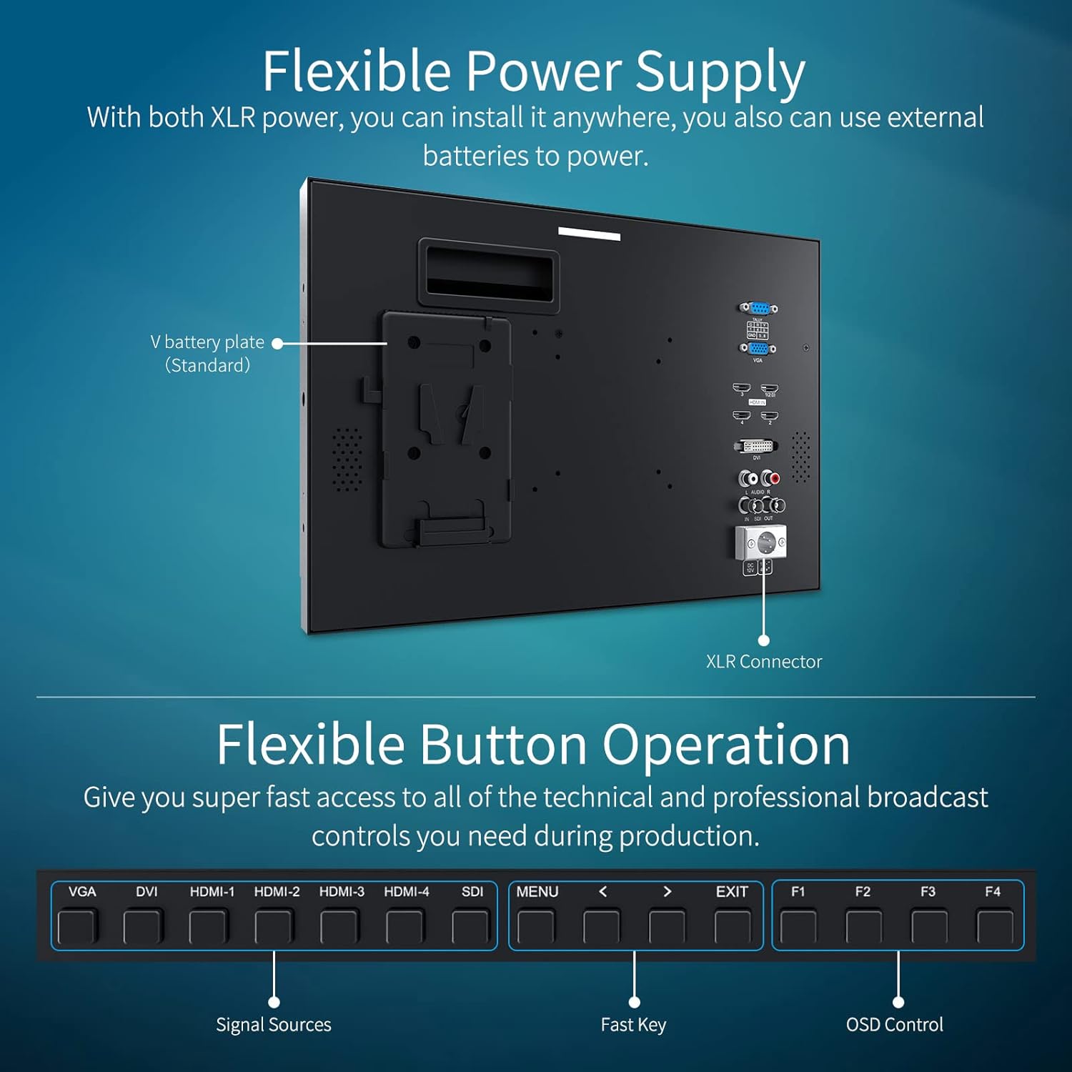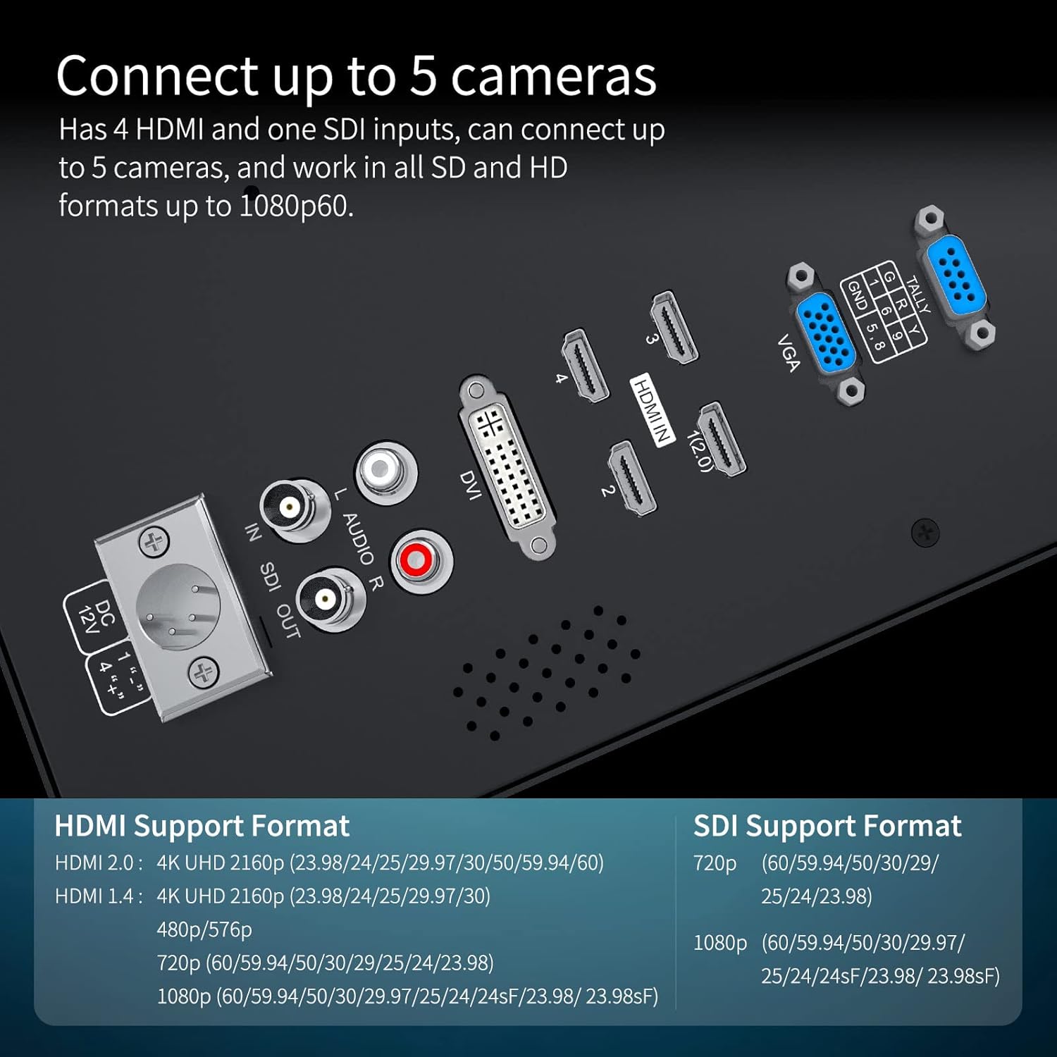 • 【Multi View Monitoring】Verfügt über vier 4K HDMI-Eingänge, einen SDI-Eingang und einen Loop-Ausgang, DVI, VGA, unterstützt Quad View, Dual View, Single View Monitoring-Funktionen, um mehrere Videoquellen auf einem einzigen Monitor anzuzeigen.