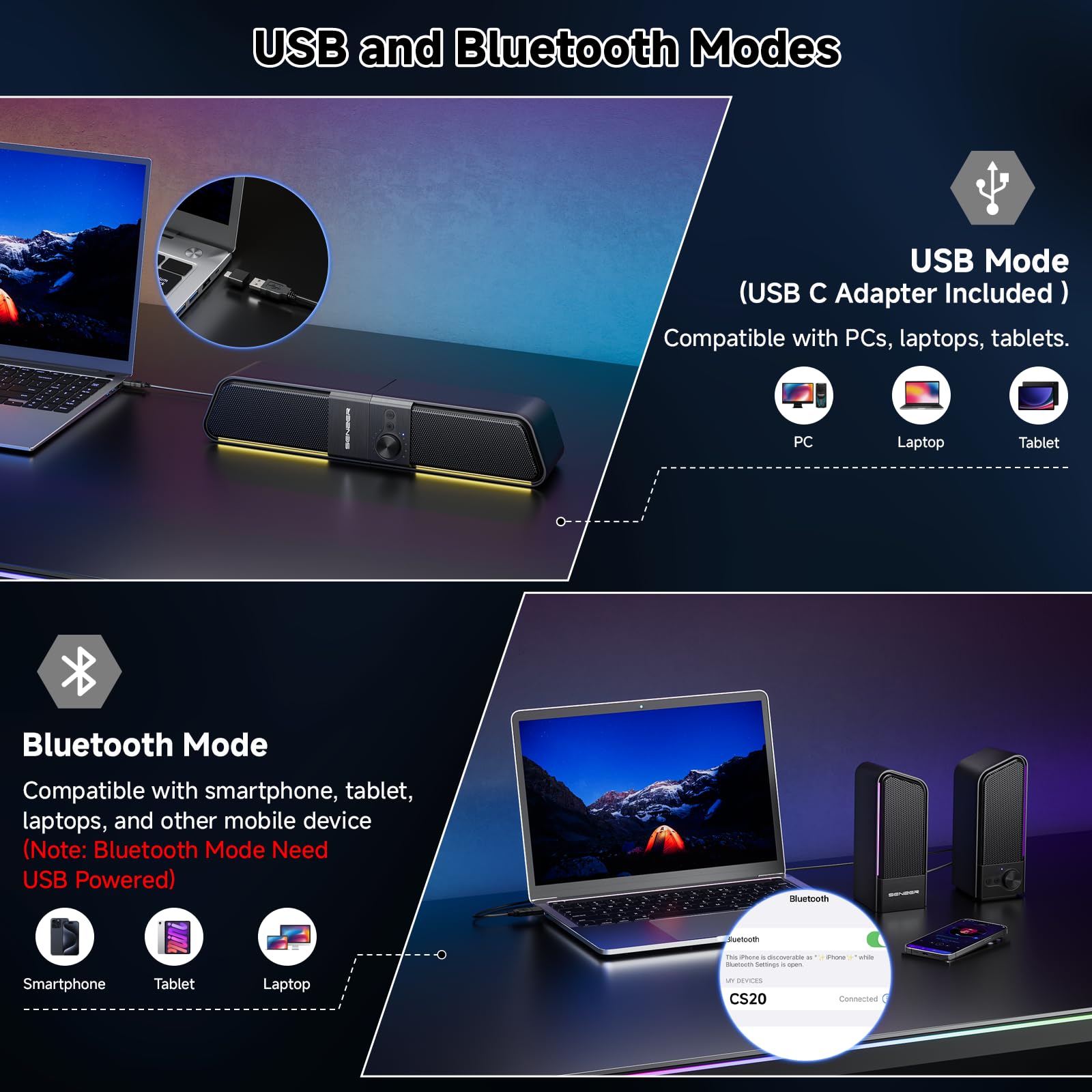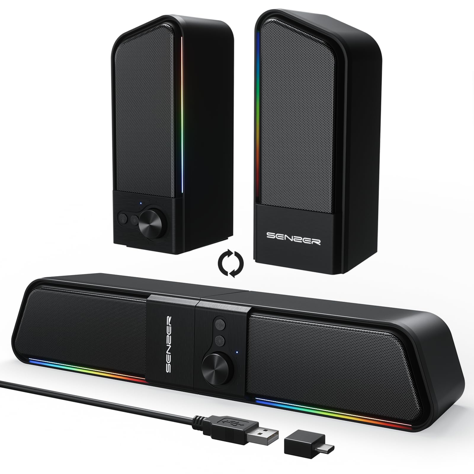 SENZER CS20 2-in-1 Bluetooth-Computerlautsprecher für Desktop-PCs, USB-Plug-&-Play-Lautsprecher mit klarem Klang, RGB-Beleuchtung, Monitor-Soundbar mit Lautstärkeregler, Gaming-Lautsprecher für PC, Laptop, Smartphone und Tablet
