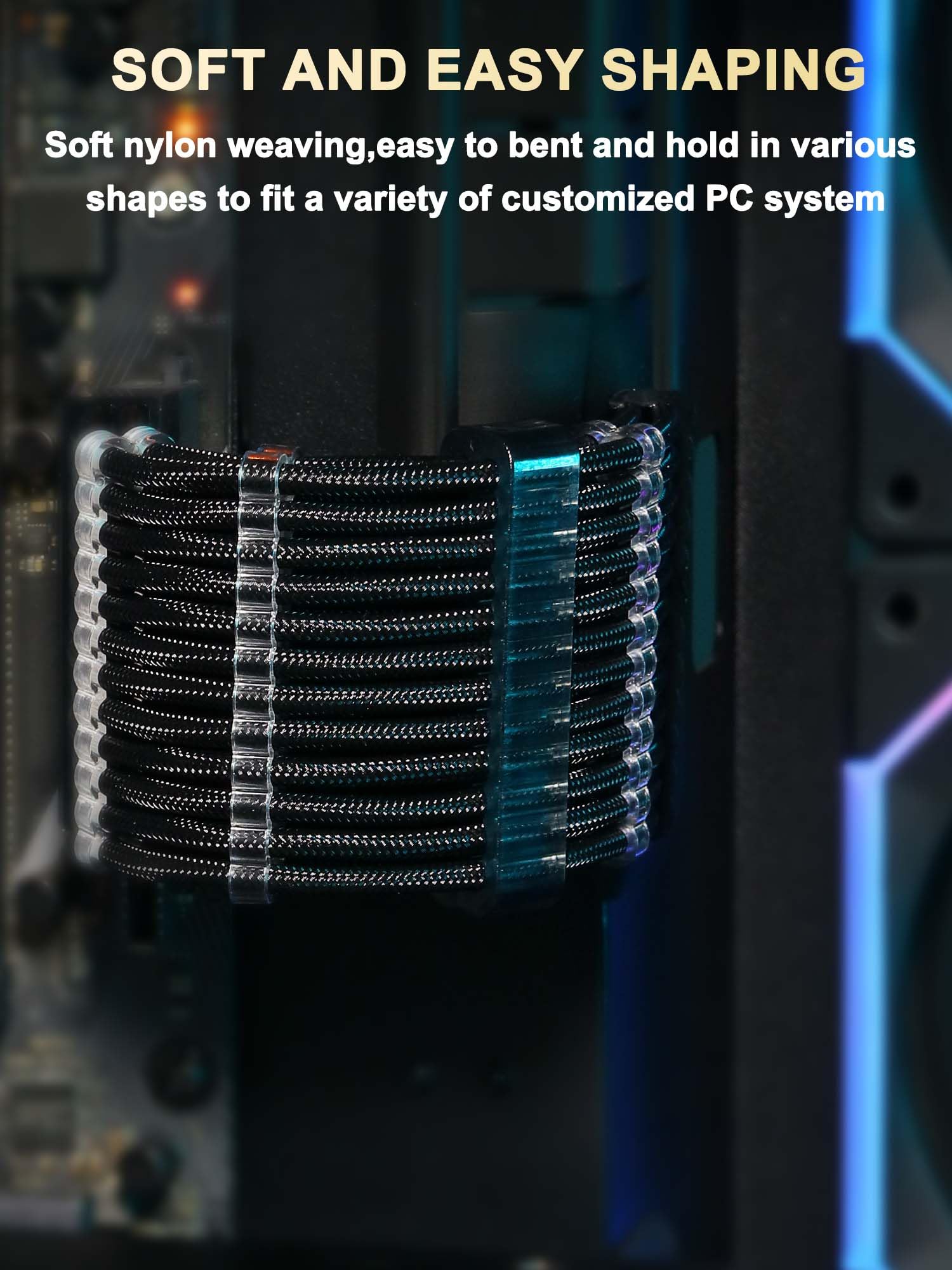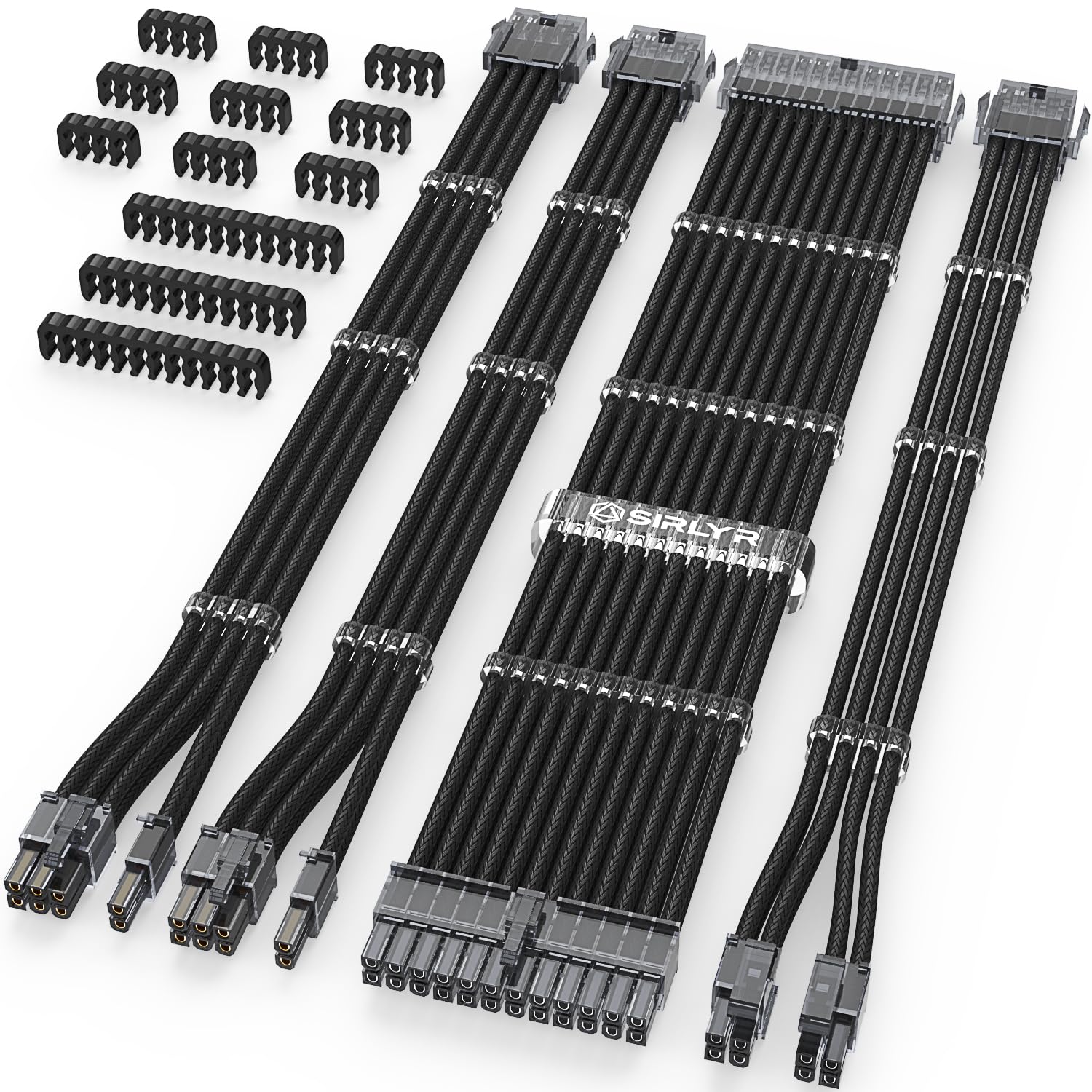 Das Sirlyr Netzteil-Kabelverlängerungsset wurde entwickelt, um die Funktionalität und Optik Ihres PCs zu verbessern. Dank der 108-adrigen, verzinnten Kupferadern bieten die Kabel höchste Flexibilität und ermöglichen eine einfache und problemlose Installation. Die hochwertigen PC-Steckverbinder gewährleisten einen sicheren und präzisen Sitz beim Anschluss an Mainboard und Grafikkarte. Jedes Kabel im Set verfügt über drei vorinstallierte, transparente Kabelkämme, die das Kabelmanagement vereinfachen. Die 8-Pin-GPU-Kabel sind mit vergoldeten Pins ausgestattet, was eine höhere Belastbarkeit und zuverlässige Stromabgabe ermöglicht und sie somit für leistungsstarke GPUs wie die RTX 3080, 4060, RX 6600 und 7600 geeignet macht. Die schwarzen, nylonummantelten Kabel sind nicht nur robust und schmutz- sowie hitzebeständig, sondern verleihen Ihrem System auch eine stilvolle Note. Das einheitliche Farbschema, das durch die schwarzen, transparenten Steckverbinder unterstrichen wird, sorgt für ein professionelles und elegantes Erscheinungsbild. Das gesamte Set verwendet 16AWG-Drahtkerne, die dicker als die üblichen 18AWG-Kerne sind und so sowohl für ein ansprechendes Design als auch für zuverlässige Leistung sorgen. Das macht das Sirlyr PSU-Kabelverlängerungsset zur idealen Wahl für alle, die die Sicherheit und Stabilität ihres Desktop-Computers verbessern möchten. Im Set enthalten: Ein 24-Pin-ATX-Kabel, ein 4+4-Pin-CPU-Kabel, zwei 6+2-Pin-GPU-Kabel, drei vorinstallierte transparente Kabelkämme pro Kabel sowie ein zusätzliches Set schwarzer Kabelkämme für ein besseres Kabelmanagement. Sirlyr hat sich der Herstellung hochwertiger, maßgefertigter Kabelverlängerungen und anderem PC-Zubehör verschrieben. Wir bieten ein Jahr kostenlosen Ersatz bei Qualitätsmängeln und unser Kundenservice steht Ihnen jederzeit bei Fragen und Problemen zur Verfügung.