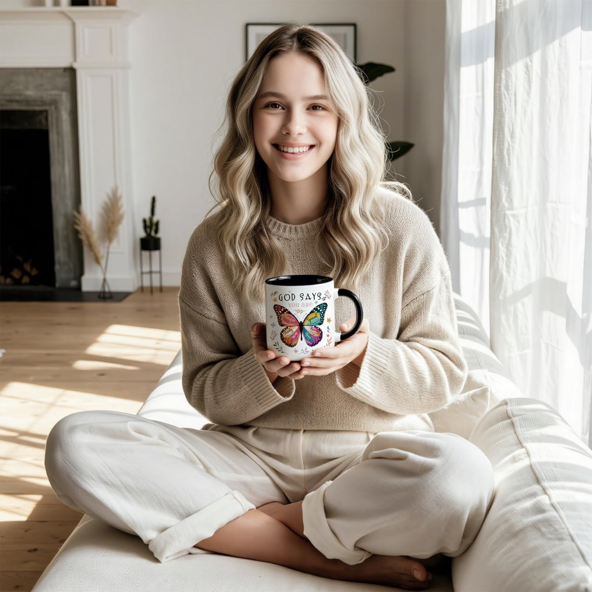 Beginnen Sie Ihren Tag mit Gottes Wort! Diese wunderschöne Keramiktasse (325 ml) zeigt einen farbenfrohen Schmetterling, Symbol für die Verwandlung in Christus. Seine Flügel sind zart mit handgezeichneten Blumenmotiven und inspirierenden Bibelversen verziert. Jeder Schluck wird zu einem Moment des Friedens und der Ermutigung.
