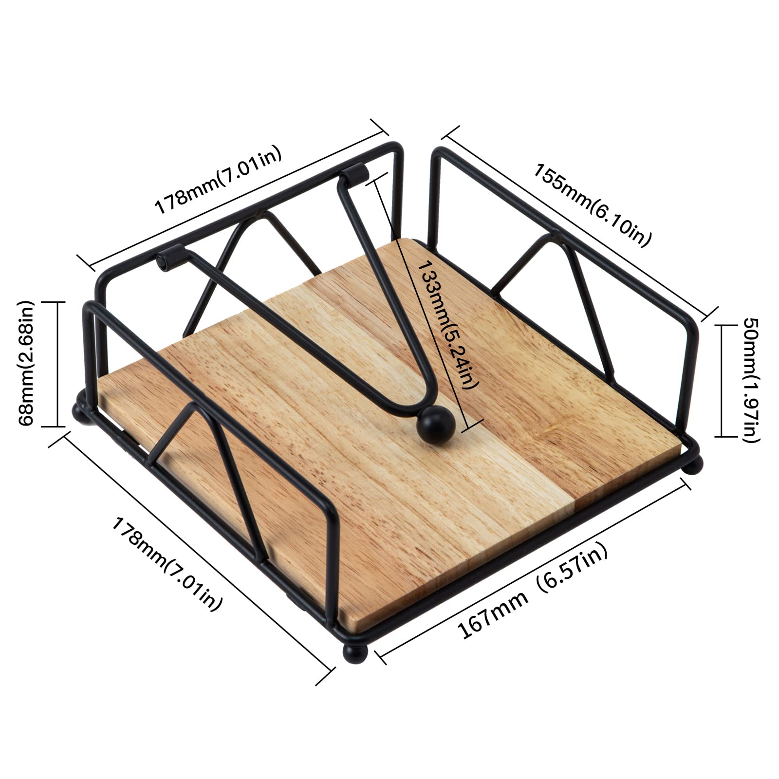 Quadratischer Serviettenhalter – Robuster Tischserviettenspender mit beschwertem Arm, Serviettenaufbewahrung aus Metall mit Holzsockel, Serviettenhalter im Landhausstil für Tisch, Küche und Arbeitsplatten (Schwarz)