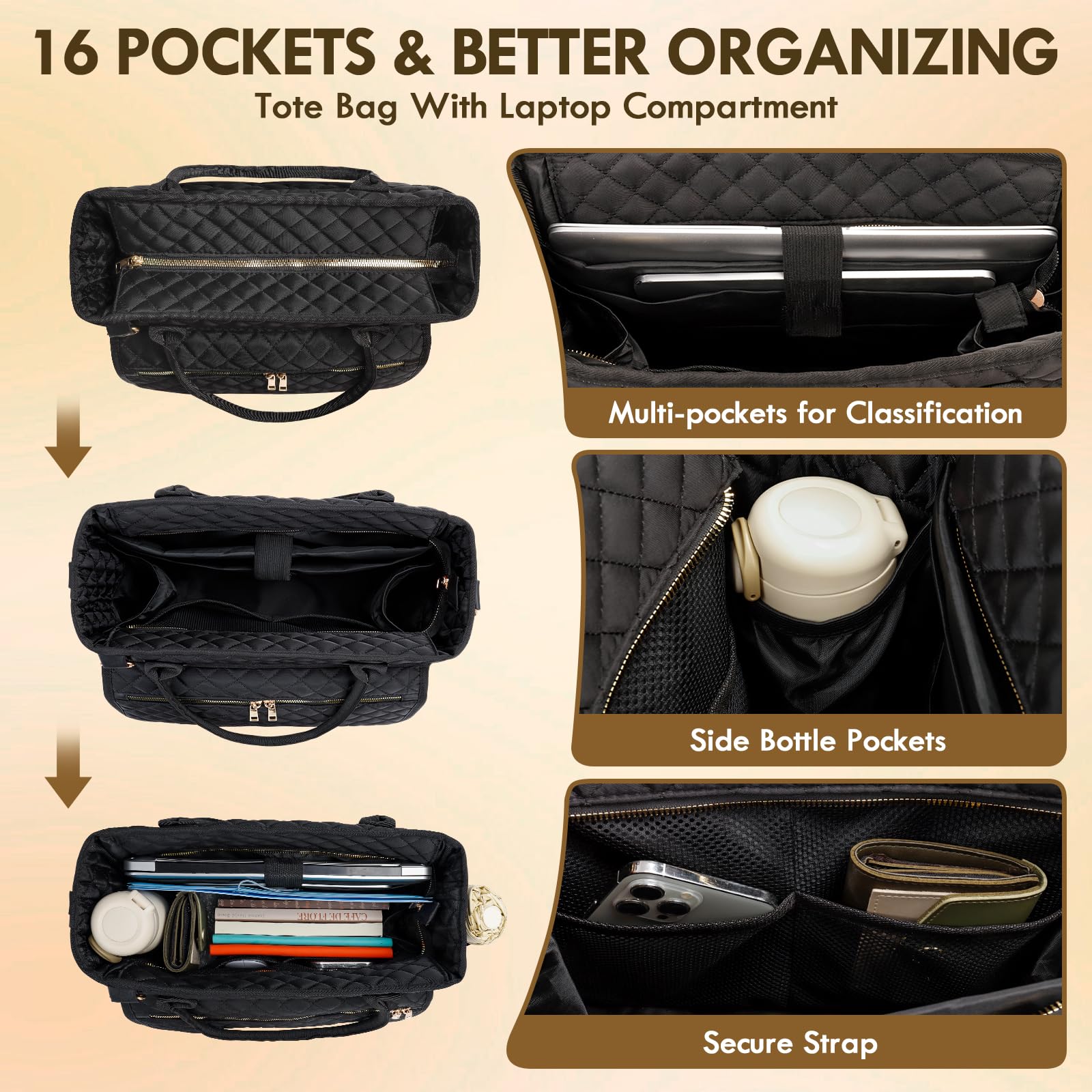 Große Lehrertasche (39,6 cm), geräumige Arbeitstasche mit Laptopfach, gesteppte Umhängetasche mit Schultergurt für Büro, Reisen, Schule und Pflegebedarf, Schwarz