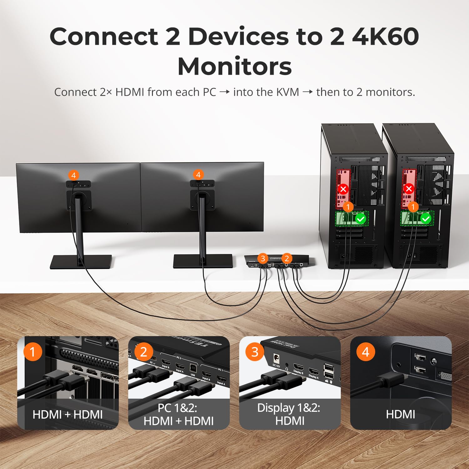 TESmart HDMI KVM-Switch für 2 Monitore und 2 Computer (4K@60Hz, USB 2.0), Dual-Monitor-KVM-Switch mit 2 HDMI-Anschlüssen, erweiterter Anzeige, EDID-Emulatoren, L/R-Audio, Hotkey-Schalter, Tastenschalter mit Eingangskabeln