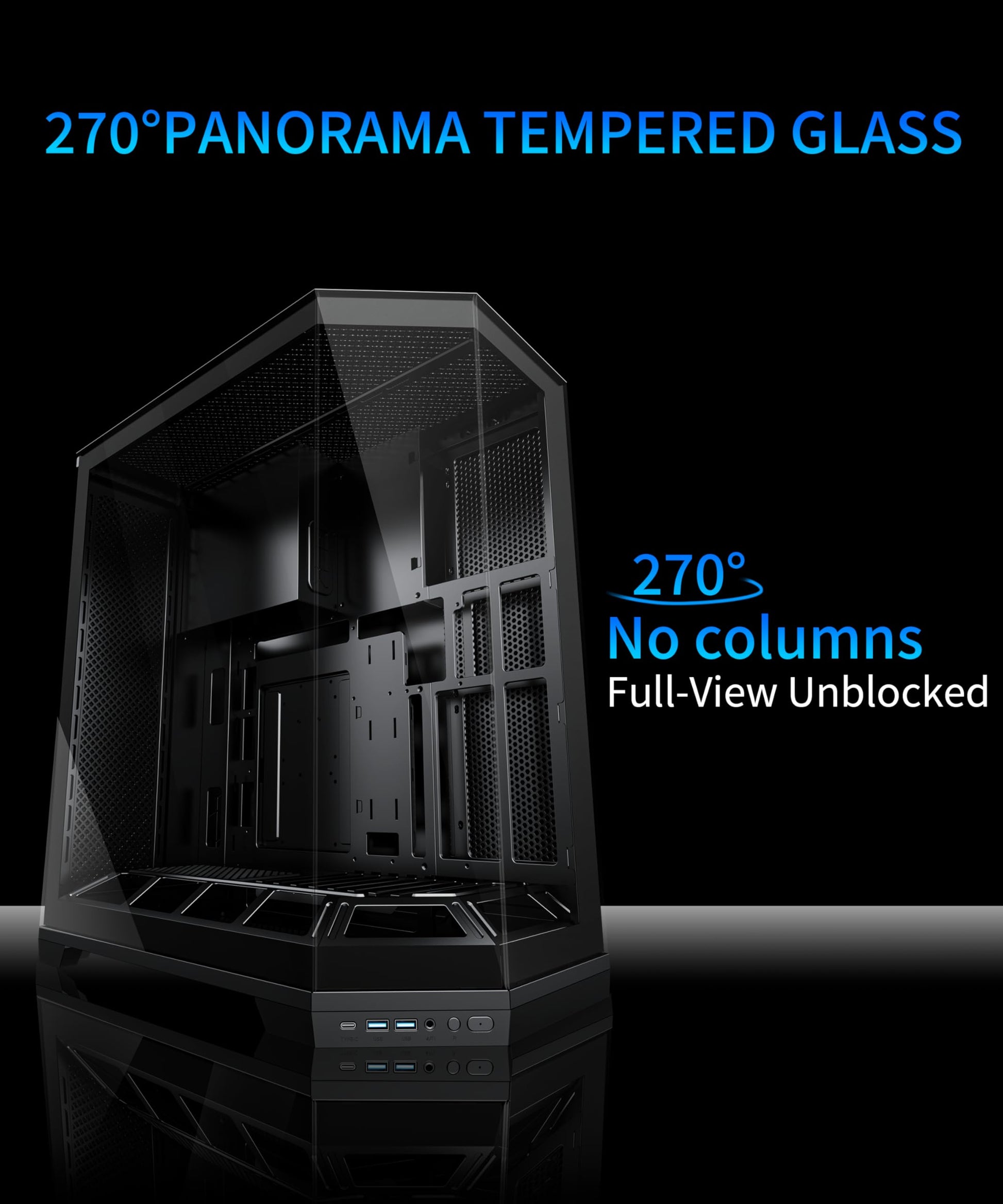 Fortschrittliches Kühlsystem vereint Leistung und Ästhetik: Ausgestattet mit 5 vorinstallierten ARGB-PWM-Lüftern – darunter 2 oben montierte Lüfter mit Vorwärtsströmung (Einlass) und 3 seitlich montierte Lüfter mit Rückwärtsströmung (Auslass) – sorgt das Gehäuse für einen vertikal ausgerichteten Luftstrom und setzt damit neue Maßstäbe für die PC-Gehäuse-Kühlung. Es bietet Platz für bis zu 10 Lüfter. Die Rückseite ermöglicht die Montage eines 240-mm- oder 360-mm-Radiators für Wasserkühlungen, während die Oberseite mit einem 240-mm-Radiator kompatibel ist. So wird eine duale Kühlung für leistungsstarke Prozessoren gewährleistet und die thermischen Anforderungen eines High-End-PC-Gehäuses erfüllt.