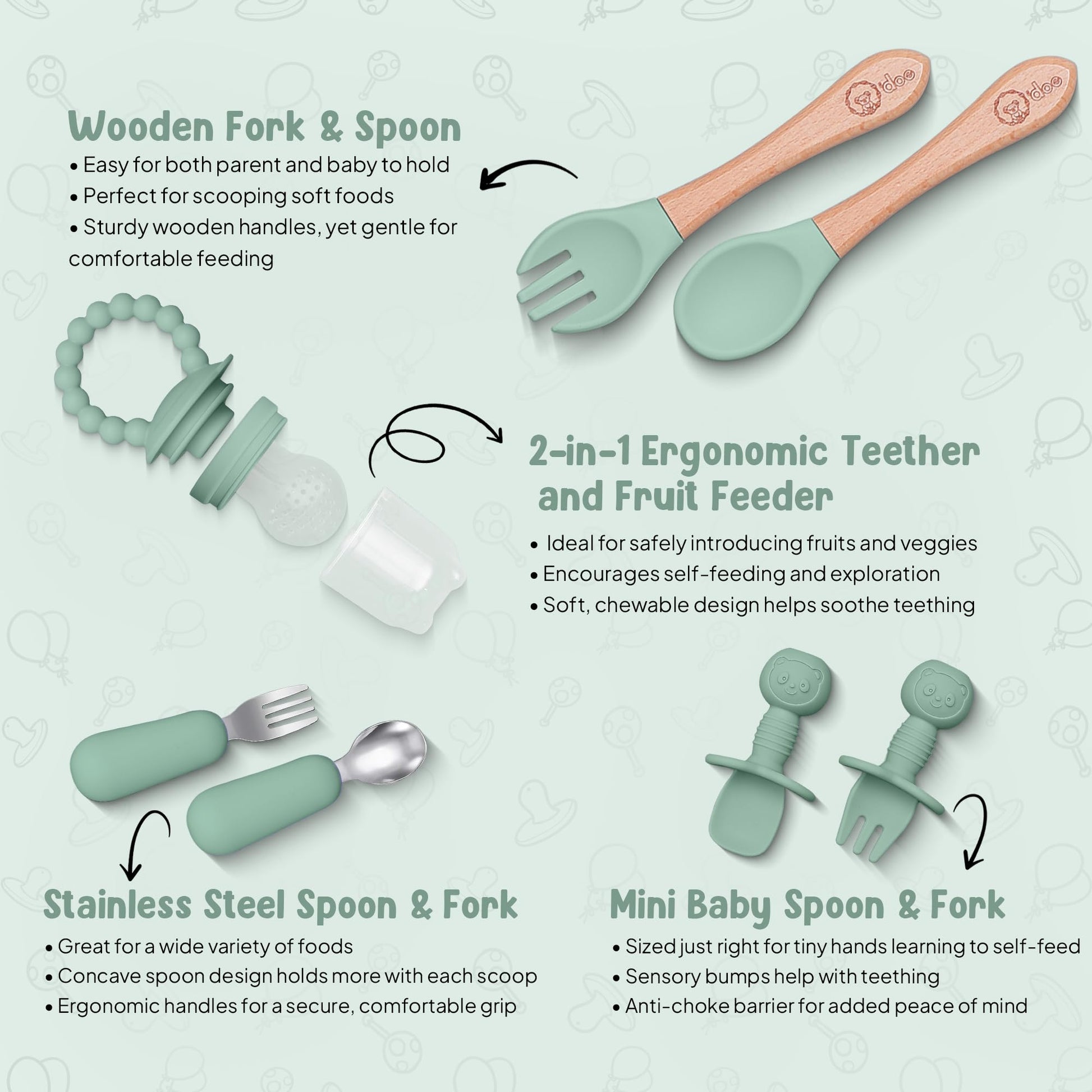 O'doe 17-teiliges BPA-freies Silikon-Baby-Fütterungsset | Dicke und weiche Saugnapfteller, Babyschalen, Holzgabel und -löffel und mehr | Macht die Mahlzeiten für Ihr Kleines einfach und unterhaltsam (Grün, V2)