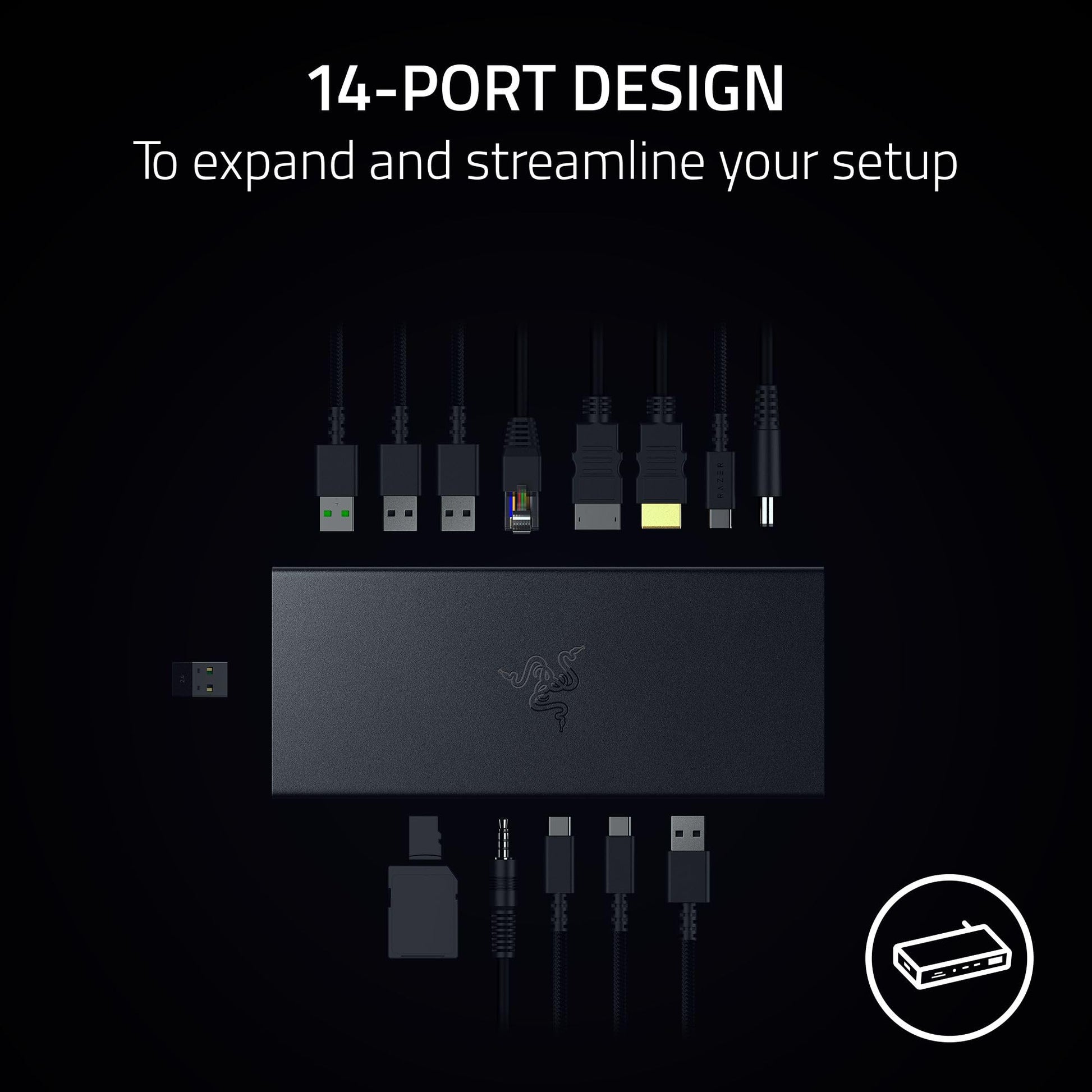 Razer USB 4 Dock: 14 Ports (Type C, Type A, HDMI, DP, Ethernet, SD, 3.5mm) - Dual Monitor Up to 4K 120 Hz - Laptop & Phone Fast Charge - Durable Lightweight Casing - Windows & Mac Compatible - Black